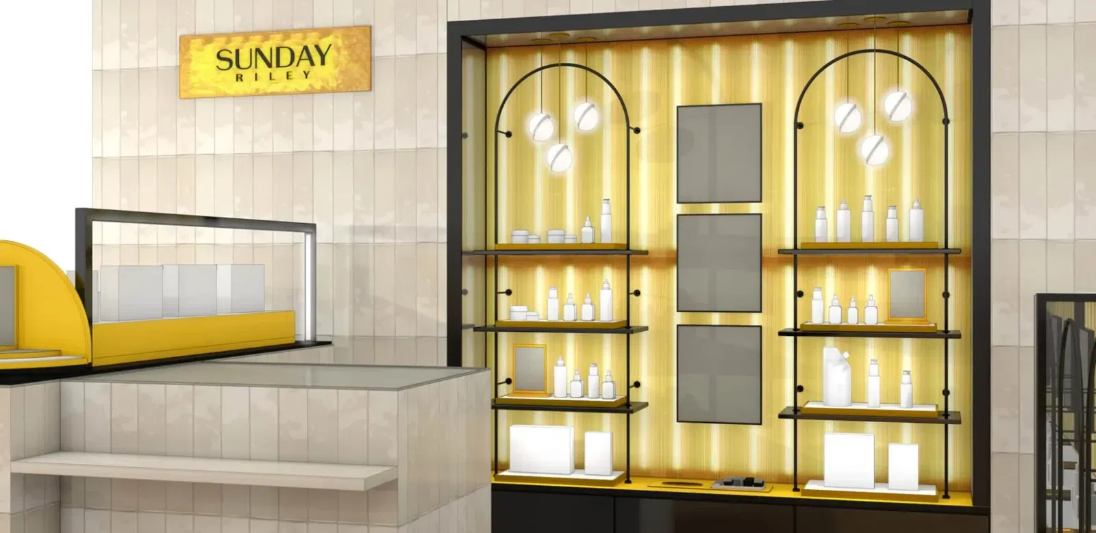 Anchored in Sunday Rileyās signature yellow pantone, we presented a creative direction inspired by the material and colour palette of the new brand concept. Black powder coated steel and yellow acrylic panels paired with a medley of lighting frames a minimalist product testing area, while a branded countertop step display sits alongside an iconic Sunday Riley product riser exhibiting a yellow āsunriseā semi-circle for further product glorification. Arched coves and the application of black arched metalwork to the midfloor bay ensures continuation of the sunrise theme